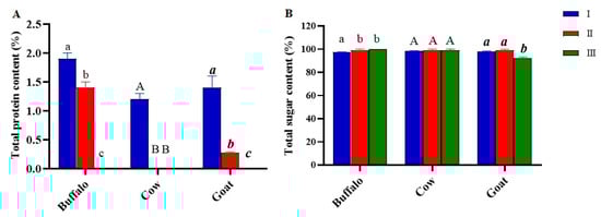 (A) Protein content (%) and (B) total sugar (%) of kefiran exopolysaccharide as influenced by different extraction methods including cold water (I), hot water (II), and mild heat-ultrasound (III). The letters on the histograms indicate the statistical analysis. Values with the same letter are not significantly different; values with different letters are significantly different. (A), Buffalo: I vs. II, I vs. III, II vs. III; Cow: I vs. II, I vs. III; Goat: I vs. II, I vs. III, II vs. III. (B), Buffalo: I vs. II, I vs. III; Goat: I vs. III, II vs. III.