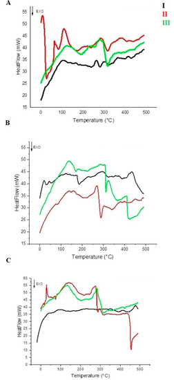 The thermal properties of the samples (3–10 mg) were ascertained with a DSC SETARAM 131 instrument. Analyses were performed from −20 °C to 500 °C at a temperature scan rate of 20 °C min−1 under nitrogen flow [26].