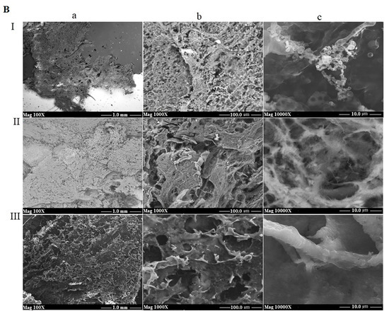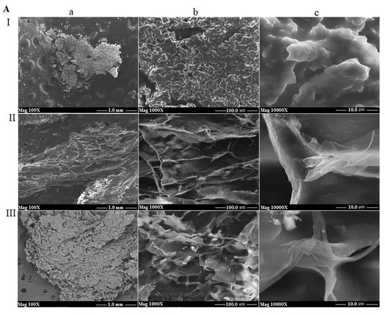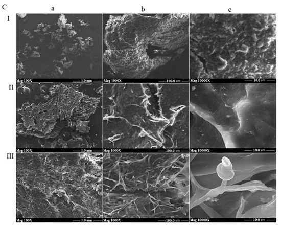 Scanning electron images of cow (A), buffalo (B), and goat (C) kefirans, extracted with cold water (I), hot water (II), and mild heat-ultrasound (III) at three different magnifications and scales: a (100X, 1.0 µm); b (1000X, 100.0 μm); c (10,000X, 10.0 μm).