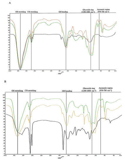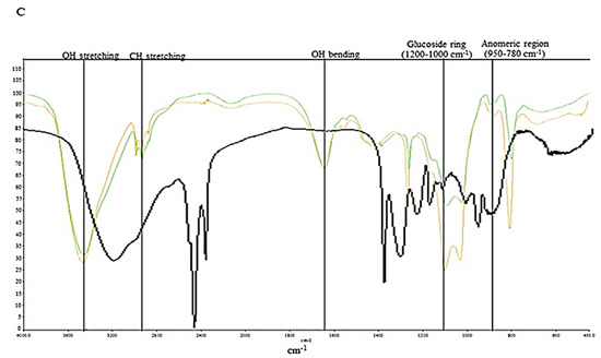 Infrared spectroscopy of all samples was carried out to further characterize the kefirans and to identify the fundamental groups of the polymer. The IR spectra obtained from all the polymers showed no significant differences in their qualitative profiles as they exhibited the characteristic bands of the kefiran [33] (Figure 8). The stretching of the O-H groups in the constituent sugar residues formed an intense peak around 3450–3291 cm−1. Two weak bands at 2923–2914 cm−1 and 2853–2814 cm−1 were associated with the vibrations of C-H in sugar rings. The peak around 1656–1634 cm−1 was formed from the bending vibration of water molecules trapped in the polysaccharide matrix. In the 1200–1000 cm−1 range, the stretching of C-O-C and C-O bonds in the ring formed two strong bands at 1076 and 1025 cm−1, which confirmed the structure of the polysaccharide [34]. In the so-called “anomeric region” ranging from 950 to 780 cm−1, characteristic weak absorptions at 950–892 cm−1 and 870–830 cm−1 were present indicating α- and β- configuration, respectively, of glycosidic bonds between monomeric units [31,35]. The spectra of the cow, buffalo, and goat kefirans extracted using method I showed deficiencies relative to the fingerprint region (1200–750 cm−1). On the other hand, the same spectra showed the presence of a significant band at 1745 cm−1 whose intensity was more pronounced in both the samples B and C, suggesting that glucuronic acid or diacyl ester was present [32].