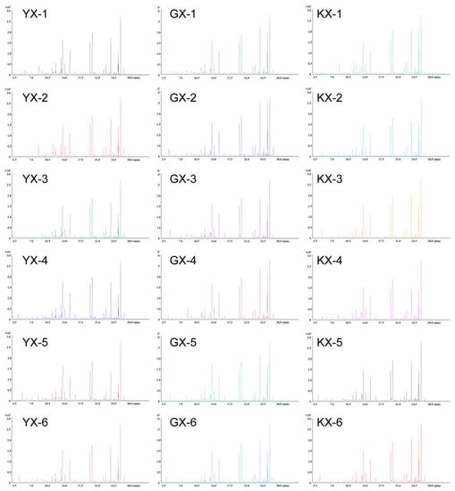 YX had the highest total VOC content, followed by KX, while GX had the lowest. Moreover, the contents of these volatile compounds mainly related to fruit flavor were found to be higher in YX (Table S1). Figure 2 shows the GC–MS total-ion current chromatograms of the VOCs in the flesh of the three cucumber cultivars.