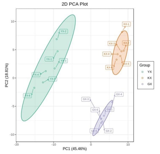 Principal components (PC) analysis of mass spectrum data of three cucumber cultivars YX, KX, and GX.