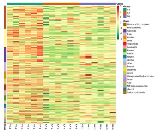A cluster analysis was further performed. Prior to analysis, unit variance scaling (UV) was used to normalize all the VOC data, and a cluster heatmap was drawn using the R software pheatmap package to analyze the metabolite accumulation patterns of different cucumber cultivars (Figure 4). According to the cluster analysis heatmap, the 163 VOCs could be divided into 15 categories. On the whole, the three cucumber cultivars could be ranked according to VOC as YX > KX > GX. According to their contents, heterocyclic compounds were the most abundant of the VOCs, followed by hydrocarbons and aldehydes. The remaining compounds with less content were found according to the following decreasing order of content: esters, alcohol, terpenoids, aromatics, ketones, amine, others, phenols, halogenated hydrocarbons, acids, nitrogen compounds, and sulfur compounds. Only a few VOCs, such as aldehydes, can produce the characteristic smell of cucumber []. However, the roles of other VOCs cannot be ignored. Although their contents are low, they still play an auxiliary and harmonizing role in fruit flavor []. The contribution of each VOC depends on its respective odor threshold and interactions with other compounds [].