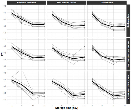 The pH measurement was done in each condition using the tray destined for microbial analyses. All pH measurements were done in triplicate (technical replicates) for each of four sampling time points. The choice of these points was inspired by the French Norm NF V01-003 used to establish the shelf life of chilled perishable and highly perishable food [24]. It consists of storing samples at 4 °C for one-third of the shelf life and then, at 8 °C during the remaining two-thirds of the storage duration. The use-by-date (UBD) established by the producers for the sausages containing the normal dose of lactate and conditioned under modified atmosphere, was 15 days for turkey sausages. Therefore, sausages were first stored at 4 °C for 5 days and then placed at 8 °C during the remaining storage duration. To be able to observe spoilage occurrence, the storage duration was extended to one UBD and half, i.e., 22 days, hence the four chosen sampling time points at 2, 8, 15 and 22 days after production, respectively. The data associated with pH are plotted in Figure 1.