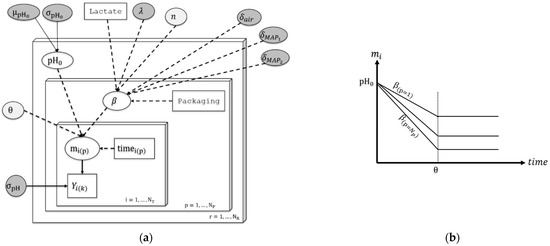 Prior distributions were specified for each model parameter and are given in Table 1. First, the prior for initial mean value of pH was defined from data extracted from previous work of Lerasle, et al. [26]. The authors provided a mean and standard deviation of the pH in fresh poultry sausages at 5.84 and 0.11, respectively. The prior of was then described by a normal distribution . The standard deviation parameters and were described by half-normal distributions half- (positive value ranges) for simplification purposes [19]. The effects of lactate and atmospheres were described using uniform distributions.