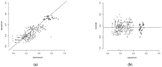 (a) Comparison of the observed experimental pH values with those adjusted by the model using point estimates of each parameter in model 3; (b) residuals versus adjusted pH values (.