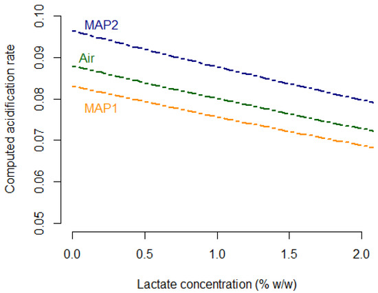The parameters of the model characterising the effects of lactate and atmospheres on acidification have been defined, for their respective prior, by non-informative uniform distribution. The experimental data enabled us to successfully estimate these parameters; their 95% credible intervals were much narrower than the prior, suggesting more targeted ranges of values. As shown in Table 3, the parameter characterising the effects of lactate on the acidification rate was estimated at −0.095 (95%CI: −0.119; −0.071). Its negative value suggested that increasing the initial lactate content in the formulation enabled one to decrease the acidification rate and, therefore, slow down the drop in pH. The additive effects of atmosphere were estimated, from lowest to highest, at −2.487 (95%CI: −2.587; −2.394) for MAP1:70%O2-30%CO2, −2.430 (95%CI: −2.528; −2.340) for air packaging and −2.339 (95%CI: −2.429; −2.254) for MAP2: 50%CO2-50%N2. These estimations suggested that, for a given sample of formulated sausages, packaging under MAP2: 50%CO2-50%N2 would accelerate the acidification phase in comparison with the air packaging and MAP1:70%O2-30%CO2. In order to better illustrate these effects, the variation in the acidification rate (, covariate of the model) was calculated using the above point estimates of and is shown in Figure 4.