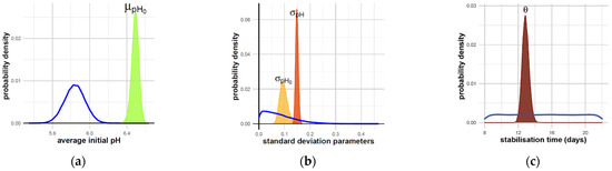 (a) Distribution of initial pH; (b) variability sources; (c) stabilization time. Prior distribution: blue curves for all parameters; posterior distributions: green curve (), light and dark orange curves ( and ), red curve (.