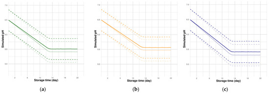 Simulation examples for pH kinetics of sausages formulated with two initial lactate contents (0.5% and 1.5% w/w) and packed under three atmospheres: (a) Air; (b) MAP1: 70%O2-30%CO2; (c) MAP2: 50%CO2-50%N2. Median curves (thick lines) and 95% credible bands (dotted lines). The transparency of the curves and the credible bands correspond to the initial lactate contents (the most transparent curves correspond to the 0.5% w/w formulation).