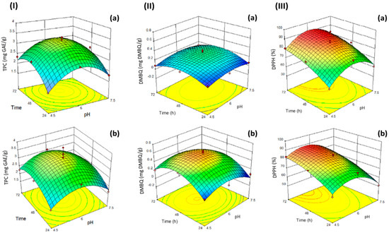Contour plots (2D) and response surface plots (3D) of the effect of pH and fermentation times on the (I) TPC (mg gallic acid equivalents (GAE)/g freeze-dried sample), (II) DMBQ contents (mg DMBQ/g freeze-dried sample) and (III) DPPH (%) of wheat germ samples following a fermentation process using either: (a) yeast (S. cerevisiae) or (b) bacteria (L. plantarum).