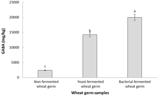 GABA contents (mg GABA/kg freeze-dried sample) in raw and fermented wheat germ samples. Data are expressed as average ± standard deviation. Different letters indicate statistical differences (p < 0.05) in the GABA contents between the different wheat germ samples.