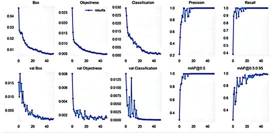 Compared with the CNN [12], the dataset used in this experiment eliminates the influence of different seasons and environments by using the flooding filling algorithm. Thus, it is no longer necessary to iterate 150 times or even thousands of times in the process of model training to ensure a high recognition rate. In this experiment, a total of 2000 datasets with four different cherry qualities were used, and each cherry quality dataset contained 500 images. Compared with the BP neural network dataset [15], the number of samples was effectively reduced, the sample feature extraction improved, the influence of environmental factors was eliminated, YOLOv5s could effectively extract the cherry image characteristics within a short period of time, and the training accuracy reached a high level. Thus, it is demonstrated that the dataset obtained after preprocessing the original image using the flooding filling algorithm is more conducive to the model’s training and learning.