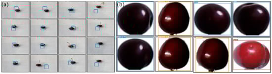 In order to enrich the training samples to improve the model performance, we rotated the images 90 degrees, 180 degrees, 270 degrees and flipped the images. Then, the flooding filling algorithm extracted the cherry image from the background, and 2000 datasets were produced. Following this, the cherry image was labeled by labeling software, called labelimg, and an XML document was generated. Subsequently, the image was transformed into the data format required for YOLOv5 training. Four-fifths of the image data was used as training data and one-fifth was used as test data. The cherry dataset comes from the literature [20]. Some sample images are shown in Figure 3.