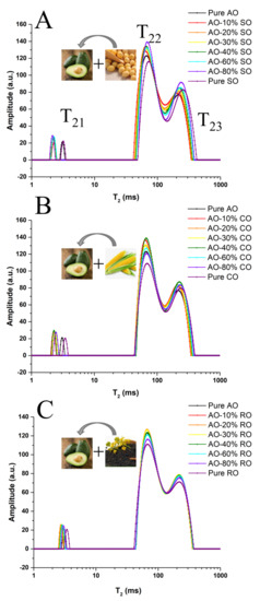 The T2 distribution of AO adulterated by SO (A), CO (B) or RO (C) (0–100%).