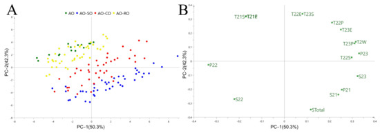 The PCA score plot (A) and loading plot (B) to distinguish pure AO from adulterated AO.