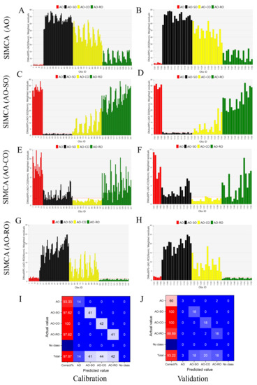 SIMCA analysis to distinguish pure AO from adulterated AO: The DModXPS+ diagram of pure AO (A,B), AO-SO (C,D), AO-CO (E,F) and AO-RO (G,H); the samples on the left (A,C,E,G) were used for calibration and the samples on the right (B,D,F,H) were used for validation; (I,J) show the specific discrimination results of calibration (I) and validation (J) in the form of confusion matrix.