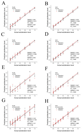 Prediction of adulteration level of AO adulterated by SO, CO or RO, as determined by the PLSR and SVR algorithm: AO-SO–AO adulterated with SO (A,B), AO-CO– AO adulterated with CO (C,D), AO-RO–AO adulterated with RO (E,F) and AO-SO/CO/RO–AO adulterated with SO, CO or RO randomly (G,H).