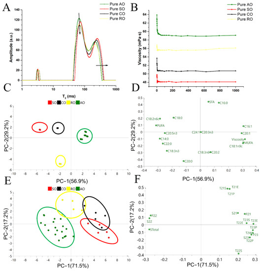 Analysis of fatty acids’ composition and viscosity of AO, SO, CO and RO to explain their differences in LF-NMR signals: (A) indicates T2 distribution of each pure oil; (B) indicates the viscosity of each pure oil; (C,D) indicate the PCA score plot and loading plot of pure oils based on data of fatty acid composition and viscosity; (E,F) indicate the PCA score plot and loading plot of four pure oils based on T2 parameters of LF-NMR profiles.