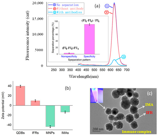 The evaluation of the performance of IFRs and IMAs. (a) The evaluation of specific/nonspecific binding between IFRs and IMAs. (b) The Zeta potentials of IFRs and IMAs. (c) The TEM of separated immune complex of IFRs (100 nm) and IMAs (200 nm).