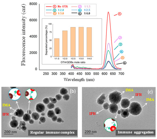 As Figure 3a, with the increase of the molar ratio of OTA/amino-QDBs for reaction, the immuno-separated percentage of IFRs by IMAs improved. When the molar ratio of OTA/amino-QDBs was higher than 2.5, the immuno-separated percentage reached an immune equilibrium. As can be seen in Figure 3b, TEM showed that each IFR (100 nm) bound one IMA (200 nm), which proved the IFRs were in univalent modification under OTA/amino-QDBs molar ratio of 2.5 for reaction. As seen in Figure 3c, when the mole ratio OTA/QDBs for reaction was higher than 2.5, IFRs were coupled with multivalent OTA that could result in the aggregation of IFRs and IMAs. The aggregation between multivalent modified IFRs and IMAs could make the competition of immuno-separation by OTA insensitive. Thus, the OTA/QDBs ratio of 2.5 was the optimal condition for IFRs preparation.