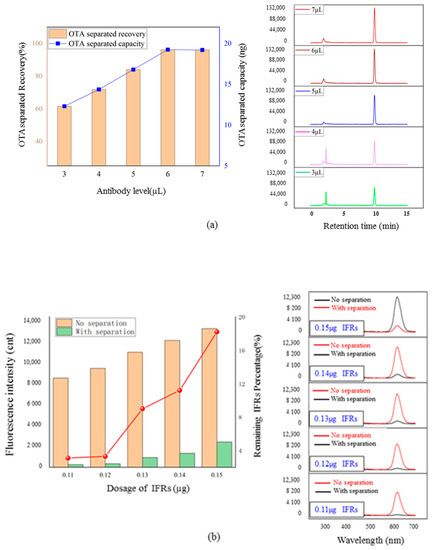 The optimization of IFRs dosage and antibody level for the immuno-separated assay. (a) Effects of antibody level on separated recovery for 20 ng of OTA. (b)Separation effects of different dosages of IFRs by 6 µL of antibody solution.