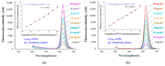 Because the (Fx − F0)/F0 value was employed to reflect the competition effect of OTA to the immuno-separation, the optimization of the IFRs dosage to obtain an appropriate F0 value is important for the quantitative performance of the assay. Appropriate F0 values were obtained using 0.13 µg and 0.14 µg of IFRs for immuno-separation by 6 µL of antibody solution. Immuno-separated assays based on these two F0 values showed a satisfied linear correlation of (Fx − F0)/F0 in response to the competition of OTA. The dosages of 0.11 µg and 0.12 µg of IFRs resulted in overly low F0 values in the same immuno-separated condition that could cause an irregular (Fx − F0)/F0 value in response to the competition of OTA. As for the application of 0.15 µg of IFRs, a too high F0 value made the response of the (Fx − F0)/F0 value to competition of OTA insensitive.