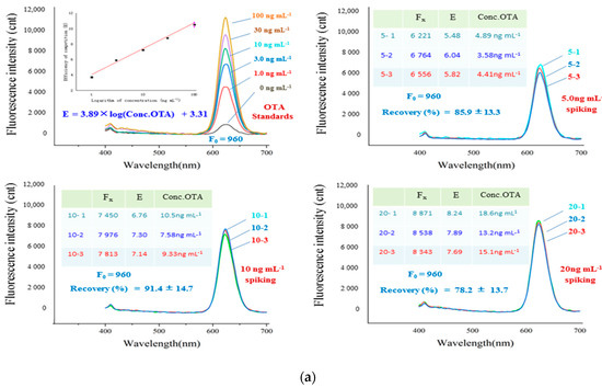 Rice samples, being confirmed as not containing OTA by HPLC-FLD, were spiked with OTA to levels of 5, 10, and 20 ng g−1, respectively, and 5.0 g of OTA-spiked rice sample was extracted with 5.0 mL of extraction buffer by vortex shaking for 15 min. The sample was centrifuged at 9000× g for 10 min, and 200 µL of supernatant was taken for the immuno-separated assay according to the process of 2.2.6. OTA-spiked beer samples were diluted with extraction buffer and detected the same as above.