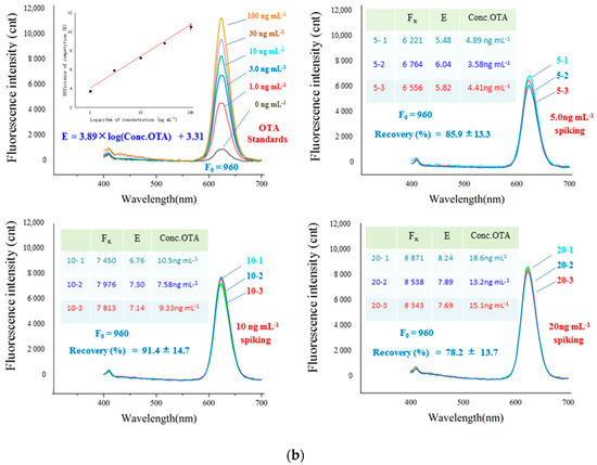 Results indicated that a minor excess dosage of IFRs to the antibody level could obtain good linear correlation of (Fx − F0)/F0 value to the OTA concentration. The (Fx − F0)/F0 value can reflect the competition effect of OTA on immuno-separation.