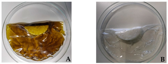 The method of preparing whey protein films was adapted from Ribeiro-Santos et al. [30]. Initially, ultrapure water was added to the whey protein concentrate (acquired online from Myprotein®—“impact whey protein”). Then, homogenization was carried out using a magnetic stirrer, obtaining a solution (8%, w/w protein). The pH was, when necessary, adjusted to 7.0 using 1M NaOH. Subsequently, the protein was denatured by heating the solution in a thermostatic bath for 30 min at 80 °C. The solution was rapidly cooled in an ice bath to room temperature (+/−23 °C). Glycerol 1:1 (protein–glycerol) was added and mixed into the solution. Furthermore, 2.5% (w/w) of the extract was incorporated into the formulation and then homogenized using an Ultra-Turrax at 14,000 rpm for 2 min. The solution was distributed in Petri dishes (13.5 mL/100 cm2). Finally, the Petri dishes were incubated in an oven (Memmert 854, Schwabach, Germany) at 40 °C for 24 h. A film without incorporation of extract in the film-forming solution was used as a blank (control). The films were stored in the Petri dishes at refrigerated temperatures. To enable the antioxidant evaluation of the films, a migration assay was performed; 6 cm2 of each film (blank and active) was immersed into 10 mL of ethanol (95%) and incubated at 40 °C for 10 days. After the incubation, the antioxidant capacity was immediately evaluated.