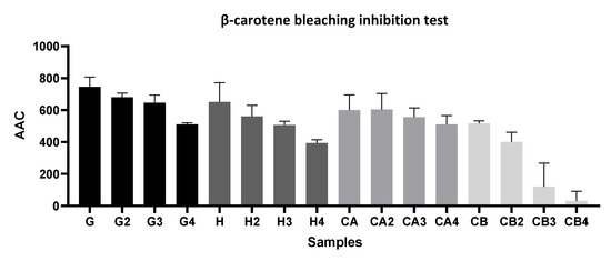 The procedure of this assay followed the method described by Miller and adapted by Andrade et al. [36]. Initially, a solution was prepared by dissolving β-carotene in chloroform (0.2 mg/mL). Next, an emulsion of β-carotene and linoleic acid was prepared using 20 mg of linoleic acid, 200 mg of Tween® 40, and 1 mL of the previously prepared solution. Chloroform was evaporated at 40 °C on a rotary evaporator. Thereafter, 50 mL of ultrapure water was added, and the solution was vigorously stirred. After it was prepared, 5 mL of the emulsion was added to 200 µL of the sample. The samples were kept in a Gerhardt SV24 thermostatic bath (1500 w) at 50 °C for 120 min. Using a Hitachi U-3900 spectrophotometer (Hitachi, Tokyo, Japan), the absorbances of the samples were measured at 470 nm. The antioxidant activity coefficient (AAC) was calculated using Equation (2):