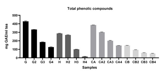 Comparison of the total phenolic compounds of different green teas and C. sinensis flower infusions. Results of TPC are expressed in mg of gallic acid equivalent per g of tea (mg GAE/g tea). G = Gorreana; H = Happy Flora; CA = Chá Camélia (leaves); CB = Chá Camélia (flowers). The numbers 2, 3, and 4 stand for the 2nd, 3rd and 4th infusions obtained by reusing the green tea leaves (G, H, CA) or C. sinensis flowers (CB).