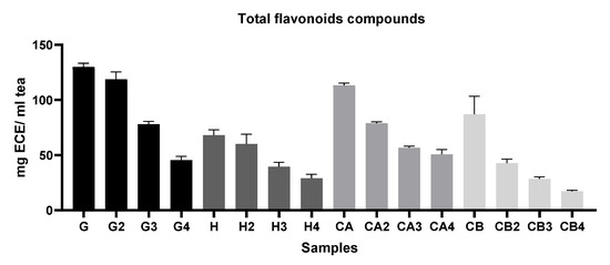 Comparison of the total flavonoid compounds (TFC) of different green teas and C. sinensis flowers’ infusion. Results of TFC are expressed as mg of epicatechin equivalent per g of tea (mg ECE/ml tea). G = Gorreana; H = Happy Flora; CA = Chá Camélia (leaves); CB = Chá Camélia (flowers). The numbers 2, 3, and 4 stand for the 2nd, 3rd and 4th infusions obtained by reusing the green tea leaves (G, H, CA) or C. sinensis flowers (CB).