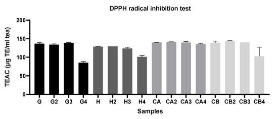 The DPPH radical (2,2-diphenyl-1-picryl-hydrazyl) assay is an easy and quick method that allows evaluating a sample’s capability to inhibit lipid oxidation by determining its free radical-scavenging capacity [37,38,39]. In short, the antioxidant reacts with the radical DPPH•, reducing it to diphenylpicrylhydrazine, leading to the discoloration of the solution [33].
