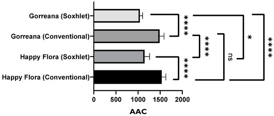 Comparison of green tea extracts prepared by two different extraction methods. β-carotene bleaching inhibition test results are expressed as AAC. **** = p ≤ 0.0001,* = p ≤ 0.05, ns = p > 0.05.