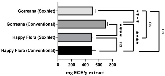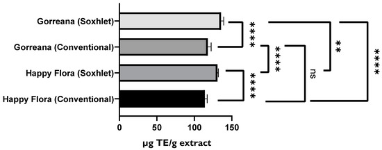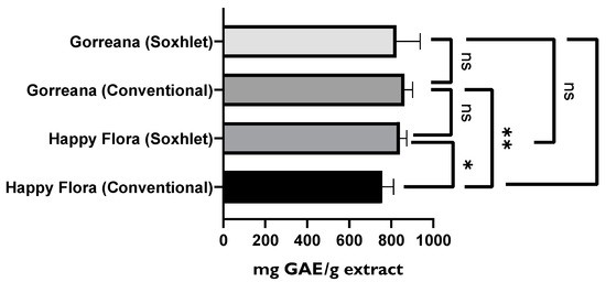 Furthermore, regarding total phenolic compound content, there were no significant differences (p > 0.05) between Gorreana extracts, even when different extraction methods were applied. However, as shown in Figure 9, significant differences (p < 0.05) between the Happy Flora extracts were observed. Furthermore, there were considerable differences between the Happy Flora extract obtained through conventional solid–liquid extraction (≈758.3 mg GAE/g extract) and the Gorreana extract obtained through the same method (≈863.1 mg GAE/g extract). In addition, there were considerable differences between the previously mentioned Happy Flora extract and the Gorreana extract obtained by Soxhlet extraction (≈833.7 mg GAE/g extract).