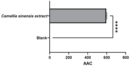 Results of the antioxidant capacity of a β-carotene bleaching inhibition test on the active films after a migration test at 40 °C for 10 days (active film—C. sinensis extract vs. control—blank film). β-carotene bleaching inhibition test results are expressed as AAC. **** = p ≤ 0.0001.