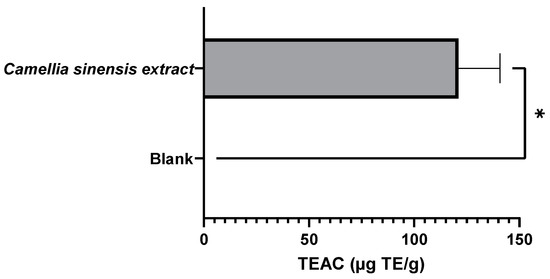 Results of the antioxidant capacity of the active films after a migration test at 40 °C for 10 days (active film—C. sinensis extract vs. control—blank film). DPPH radical inhibition test results are expressed in mg Trolox equivalent per g of film (µg TE/g film). * = p ≤ 0.05.