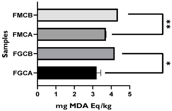 Results of TBARS assay for goat and mixture fresh cheese samples packaged with the control film (without green tea extract) and active film (with green tea extract). FMCB—mixture fresh cheese packaged with the control film; FMCA—mixture fresh cheese packaged with the active film; FGCB—goat fresh cheese packaged with the control film; FGCA—goat fresh cheese packaged with the active film. * = p ≤ 0.05, ** = p ≤ 0.01.