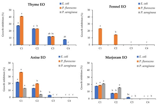 Antibacterial activity of the studied essential oils against 3 isolated bacteria at 4 different concentrations. Where: C1, C2, C3 and C4 are the tested concentrations of each studied EO at 80, 60, 40 and 20 mg/mL, respectively. Bars with different letters are significant according to Waller–Duncan multiple comparison test post hoc test at p < 0.05 using SPSS statistical analysis software.