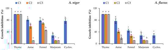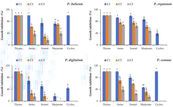 Antifungal activity of the studied essential oils against the isolated fungi at three different concentrations. Where: the tested concentrations C1, C2 and C3 are of each studied EO at 2.0, 1.0 and 0.5 mg/mL, respectively. Bars with different letters are significant according to Waller–Duncan multiple comparison test post hoc test at p < 0.05 using SPSS statistical analysis software.