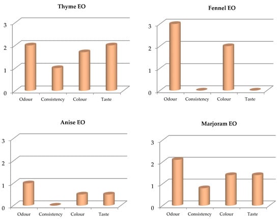 Sensory test of each single tested oil. Where the scale of the sensory test is: 0: No difference from control; 0–1: Similar to control; 1–2: low difference from the control; 2–3: highly different from the control. The used concentrations for the studied EOs were thyme 40 mg/mL; fennel 80 mg/mL; anise 60 mg/mL and marjoram 60 mg/mL.