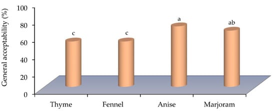 In particular, meat treated with the thyme and marjoram EOs showed a similarity with the control (non-treated meat), especially with regard to consistency (Figure 3). However, meat treated with the fennel and anise EOs showed a great similarity with the control in terms of taste and consistency (Figure 3). In addition, the anise and marjoram EOs showed the highest significant value of the acceptability among the testers (Figure 4). Anyway, even the treated meat with the other EOs did not give a non-preferred odor and/or flavor as referred by the testers.