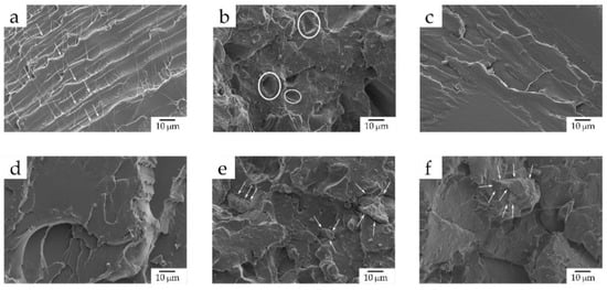 In order to better ascertain the effect of the SCG particles and the two tested OLAs on PLA, the morphology of the fracture surfaces of the injection-molded pieces obtained after the impact tests were observed by FESEM. The resultant micrographs are presented in Figure 5. As it can be observed in Figure 5a, the neat PLA piece displayed the characteristic morphology of a polymer with brittle behavior due to the formation of a smooth fracture surface with the presence of microcracks (see the white arrows). A similar morphology was previously reported for PLA by Quiles-Carrillo et al. [61], confirming the aforementioned mechanical properties in relation to its low impact strength and ductility. Conversely, in Figure 5b, the fracture surface of the piece changed to a rougher morphology, as a result of the increase in ductility and the presence of the SCG fillers. However, the existence of some holes (identified in the image by white circles) corroborates the lack of compatibility between the PLA matrix and SCGs. These voids correspond to the lignocellulosic particles that were detached after impact [14]. Although a good dispersion of the SCG particles along the PLA matrix can be inferred due to the manifold presence of well-distributed holes, the suggested poor filler-to-matrix adhesion contributed to a reduced mechanical resistance, as shown above, during the mechanical analysis.