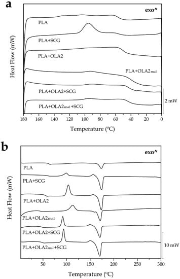Differential scanning calorimetry (DSC) thermograms of the injection-molded pieces of polylactide (PLA)/spent coffee grounds (SCGs) containing the oligomers of lactic acid (OLAs) during cooling (a) and second heating (b).