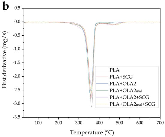 (a) Thermogravimetric analysis (TGA) curves and (b) first derivative (DTG) of the injection-molded pieces of polylactide (PLA)/spent coffee grounds (SCGs) containing the oligomers of lactic acid (OLAs).