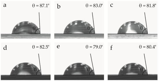 Water contact angle of the injection-molded pieces of polylactide (PLA)/spent coffee grounds (SCGs) containing the oligomers of lactic acid (OLAs): (a) PLA; (b) PLA + OLA2; (c) PLA + OLA2mal; (d) PLA + SCG; (e) PLA + OLA2 + SCG; and (f) PLA + OLA2mal + SCG.