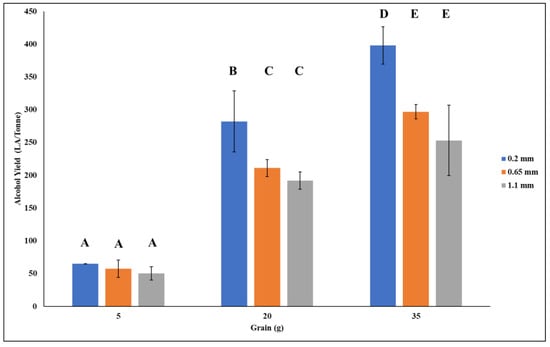 Mean alcohol yield achieved using different grain amounts and grain particle sizes. Results are presented as mean (n = 3) and error bars indicating standard deviation. The same letter indicated no significant differences, as determine by one-way ANOVA with the Tukey post hoc test.