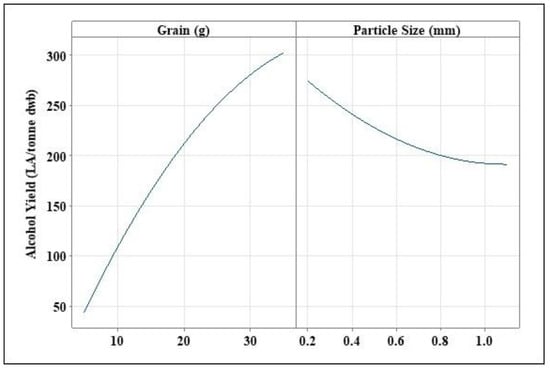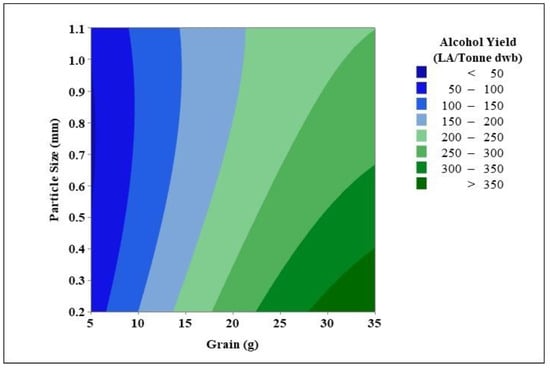 The linear terms have both a positive and a negative impact on alcohol yield, as can be seen in Equation (9). For example, while each gram of grain added to the process yields an extra 18.59 LA/tonne, as grain particle size increases, alcohol yield production also increases. This indicates that greater alcohol yield is achieved when grain amounts are increased and when lowering grain particle size. Grain amounts are a negative element in the quadratic equation, suggesting that there is a maximum amount of grain that can be added to provide optimal yields, after which alcohol yield decreases. At between 50 and 54 g of grain (Equation (9)), the maximum alcohol yield is theoretically obtained based on the regression equation, after which the yield should drop. Grain amounts ranging from 48 to 62 g were studied at a grain particle size of 0.2 mm. It would be expected that theoretical yields of 442–445 LA/tonne would be achieved between 50 and 54 g. However, this was not the case. Maximum yield was in fact obtained at 48 g, achieving 403.50 LA/tonne, while 50–54 g only achieved 315–325 LA/tonne. Alcohol yield at 48 g, 403.50 LA/tonne, is greater than alcohol yield (398.25 LA/tonne) achieved at 35 g, but marginally. One-way ANOVA showed no significant difference in alcohol yield achieved using 35 and 48 g of grain (p-value = 0.321); therefore, adding more grain to achieve slightly higher alcohol is futile.