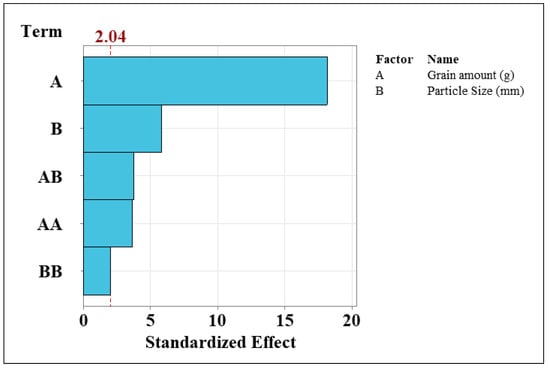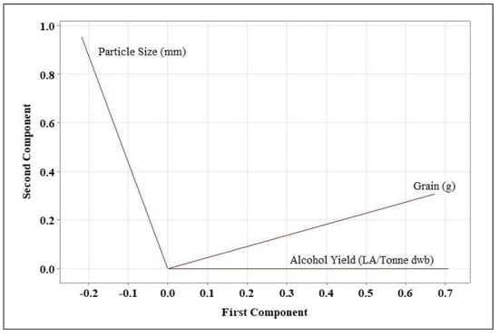The normalised impacts of both the dependent and independent variables in response to the independent variable are shown in Figure 3. The terms are arranged in ascending order of importance. Figure 3 shows that A (quantity of grain) has a higher impact on the system than B (grain particle size). Moreover, grain particle size and the interaction of A and B has a significant impact on the process. When looking at grain flour quantities, grain particle size and alcohol yield, principal component analysis reveals a stronger link between alcohol yield and grain flour quantities (Figure 4). These findings imply that grain flour quantity is a controlling factor, and that alcohol yield will increase only because of this. The size of grain particles is crucial, yet it has little impact on alcohol yield. This was noted previously, in that there were no significant differences across particle sizes for 5 and 20 g of flour, while at 35 g a significant difference was seen between grain particle sizes, with a grain particle size of 0.2 mm yields, resulting in the highest alcohol yield.