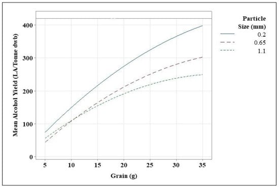 Interaction plots were used to examine how the dependent and independent factors interact with the independent variable and Figure 6 depicts the results of some interesting observations. The grain particle size of 0.2 mm consistently produces a higher alcohol yield than either 0.65 or 1.1 mm in all grain amounts. Alcohol yield at 35 g grain ranges from 300 to 400 LA/tonne, depending on grain particle size. Optimum yields were found at 0.2 mm grain size, which produces one-third more alcohol than either 0.65 or 1.1 mm. This demonstrates that a grain size of 0.2 mm produces the greatest results and is therefore considered the ideal grain particle size. In terms of alcohol yield, there are several interesting findings between 0.65 mm and 1.1 mm grain sizes. Initially, 1.1 mm gave significant alcohol yields at 5 g of grain compared to a grain particle size of 0.65 mm (p value = 0.025), but as grain quantities increased to 10 g, both 0.65 and 1.1 mm yielded the same quantity of alcohol. When grain flour quantities increased further (35 g), alcohol yield was greater at 0.65 mm (300 LA/tonne) than at 1.1 mm of grains (approximately 253 LA/tonne) (p = 0.0005). The grain size of 1.1 mm, and the combination of hard wheat adsorbing water meant that there was inadequate mixing. This was noted during both cooking, where a thick cake formed, and during mashing, when the malted barley that was added remained on the top of the cake rather than being homogenous with the wort. This is, however, something that could be corrected during cooking if a lower temperature was used. Furthermore, it was noted that at lower cooking temperatures during experimental runs, less of a cake formed at 72 and 82 °C, when compared against 92 °C. Equally, liquefaction of starch seems to occur at a quicker rate at lower temperatures. However, this could also be attributed to the α-amylase working more efficiently at a lower temperature [12,30,32]. Nevertheless, a lower temperature may mean that starch is not fully gelatinised, or it could be retrograded back, meaning a limited amount of starch to be converted to fermentable sugars [12,30].